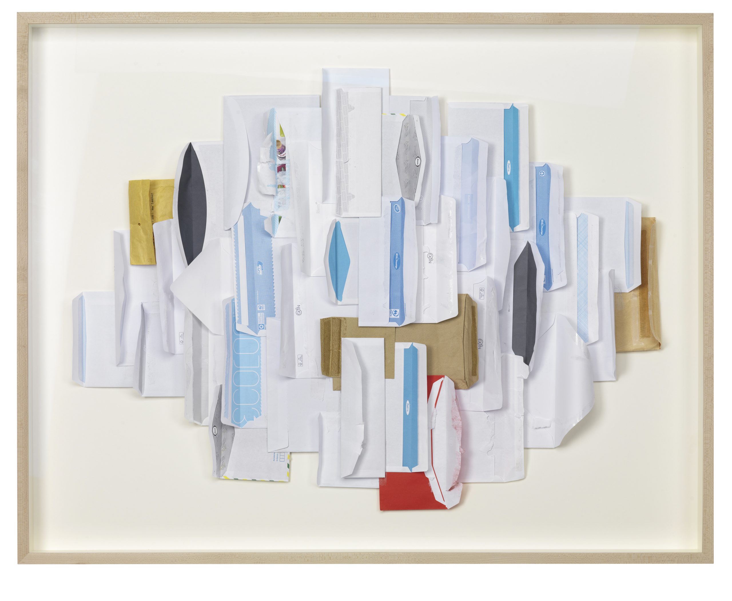 Pieces on paper, the fruit of collage, recycle the correspondence that arrives every day in the artist’s post box. Here, junk mail is cut up, deconstructed and mixed in with documents from another era. This paper architecture superimposes potentially very personal stories with the most impersonal of information. The joyous organization that oversees the assembly of this anonymous correspondence goes against the rigidity embodied by the bureaucratization of tasks and relations between workers.