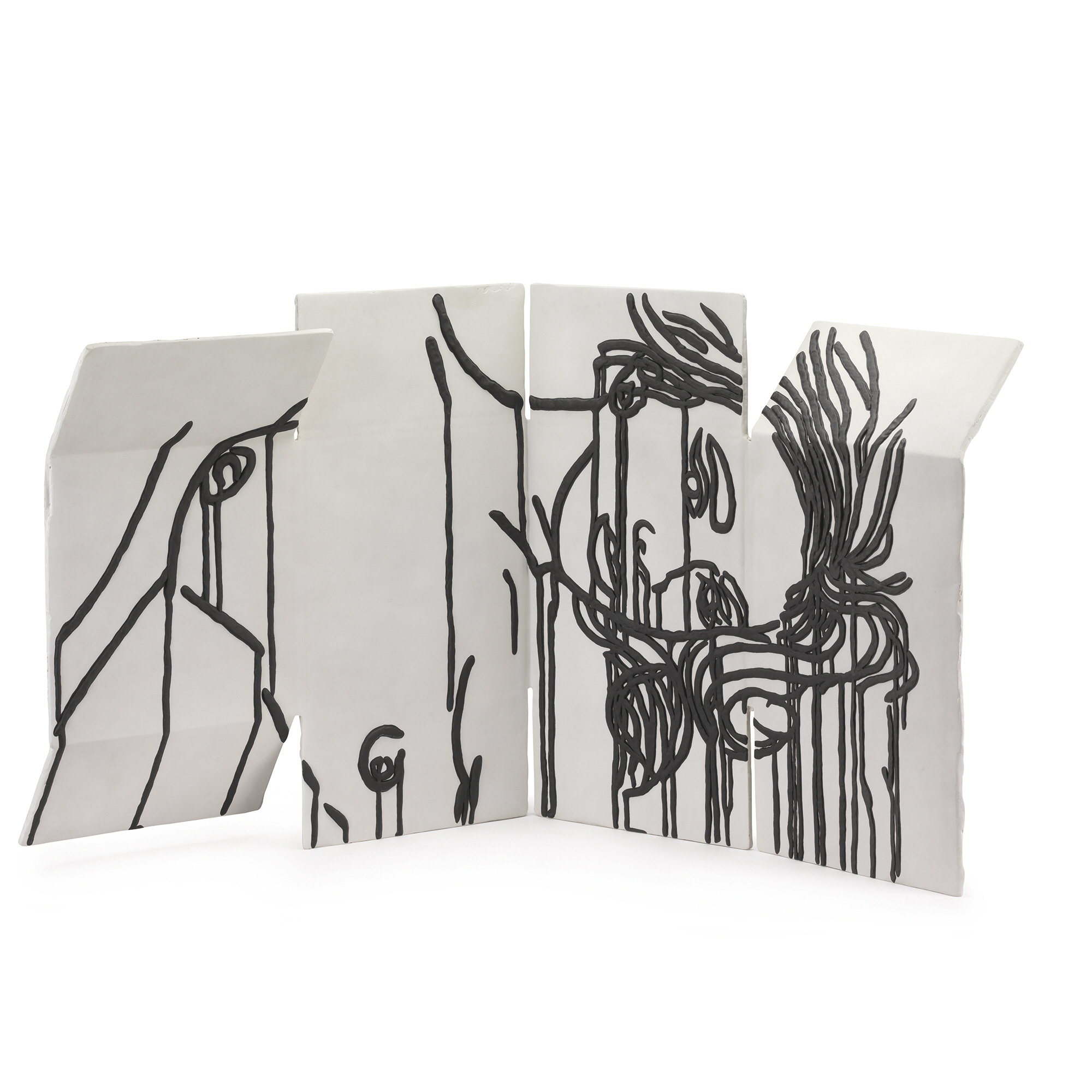 Ghada Amer est très connue pour ses peintures brodées subversives et féministes qui s’approprient l’imagerie de magazines pornographiques pour interroger le rôle de la femme, de la sexualité et du plaisir dans les sociétés contemporaines. Tout au long de sa carrière, l’artiste n’a cessé de repousser les limites du médium avec lequel elle travaillait. En 2014, quand elle commence à réaliser des céramiques, elle fabrique d’abord une maquette à l’aide d’une boîte en carton, peignant ses formes et visages féminins emblématiques à l’encre directement sur ce support. Très malléable, la boîte en carton permet à l’artiste d’anticiper la manière dont la céramique peut se plier et se plisser, figurant un rendu extrêmement réaliste. En 2020, Ghada Amer repousse à nouveau les limites de sa propre pratique en coulant ses dessins et la forme de la boîte en carton dans le bronze. Cette œuvre de la Collection RAJA est l’une des premières de cette nouvelle série.