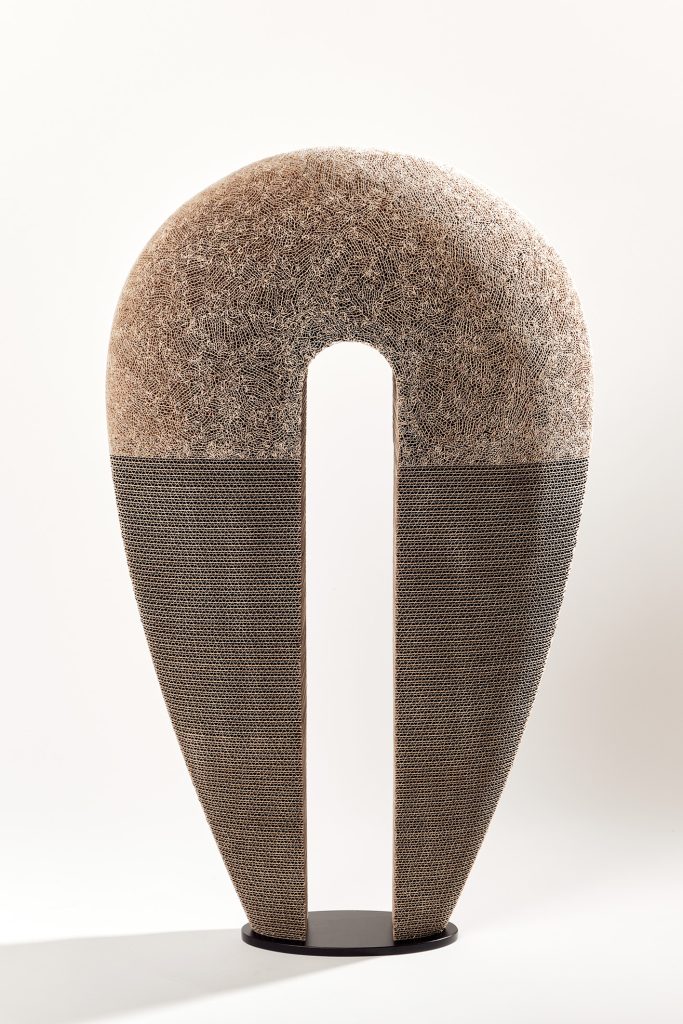 Marie-Anne Thieffry expérimente avec le matériau carton depuis plus d’une quinzaine d’années : elle aime la douceur et la modestie de ce matériau, qu’elle peut manipuler à la recherche de formes légères et épurées, comme le montre la sculpture Sérénité. L’œuvre impressionne par ses détails, et l’œil peut au premier abord ne pas reconnaître le carton que l’artiste travaille de diverses manières : la dentelle (découpage minutieux au cutter de fines lamelles de carton) qu’elle plisse et froisse pour lui donner la forme désirée sur un moule, et le contre collage mettant en valeur la cannelure de la matière. L’artiste utilise exclusivement du carton récupéré, un surcyclage qui fait partie intégrante de sa démarche.