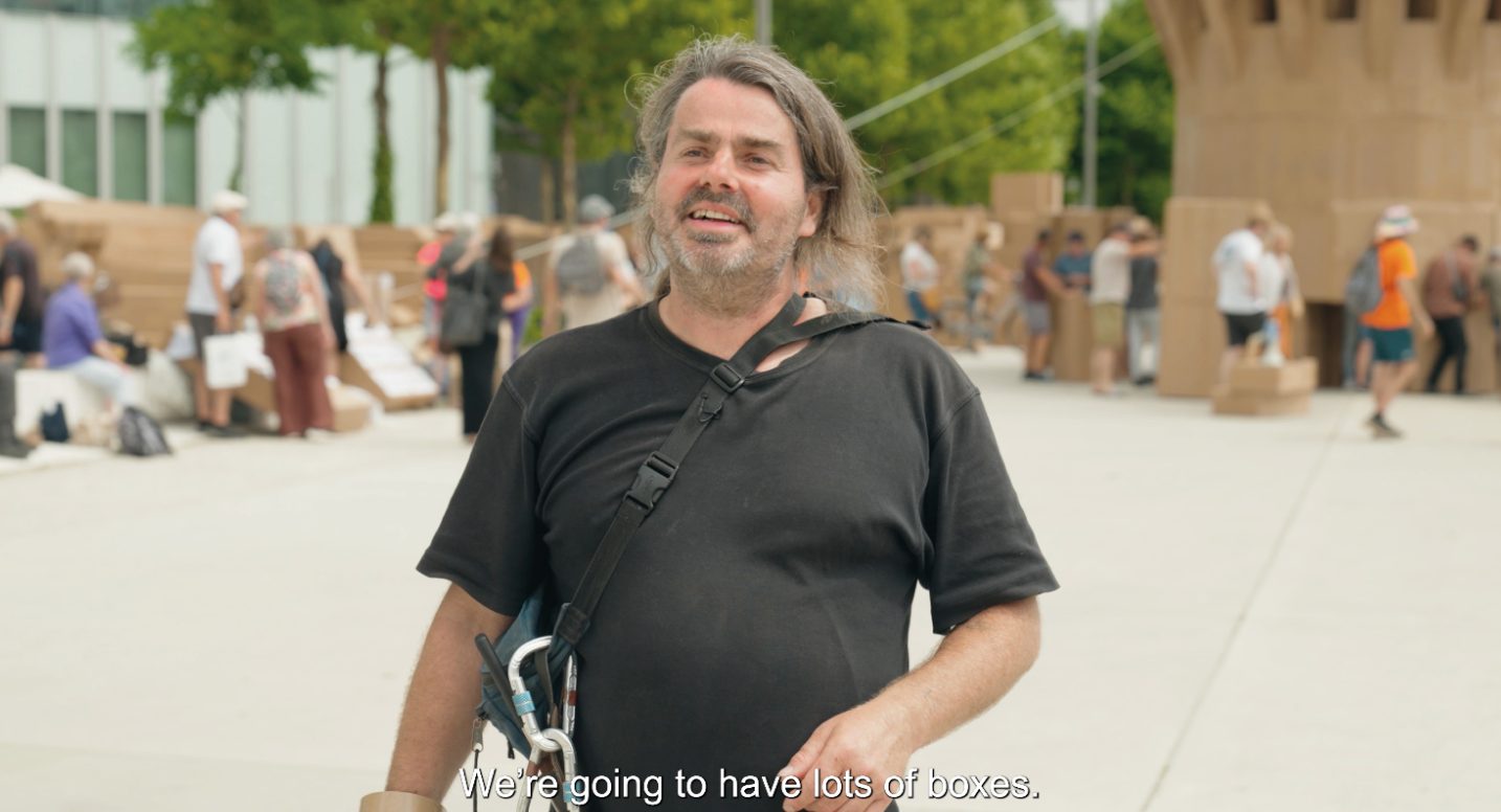 Les caisses en cartons sont assemblées et découpées par des centaines de volontaires « bâtisseurs » au cours d’ateliers ouverts à toutes et tous, dans une démarche collective d’assemblage et de partage. La Collection est ravie de permettre la production de ces œuvres entièrement composées de carton, qui, une fois assemblées, pèseront plusieurs tonnes !