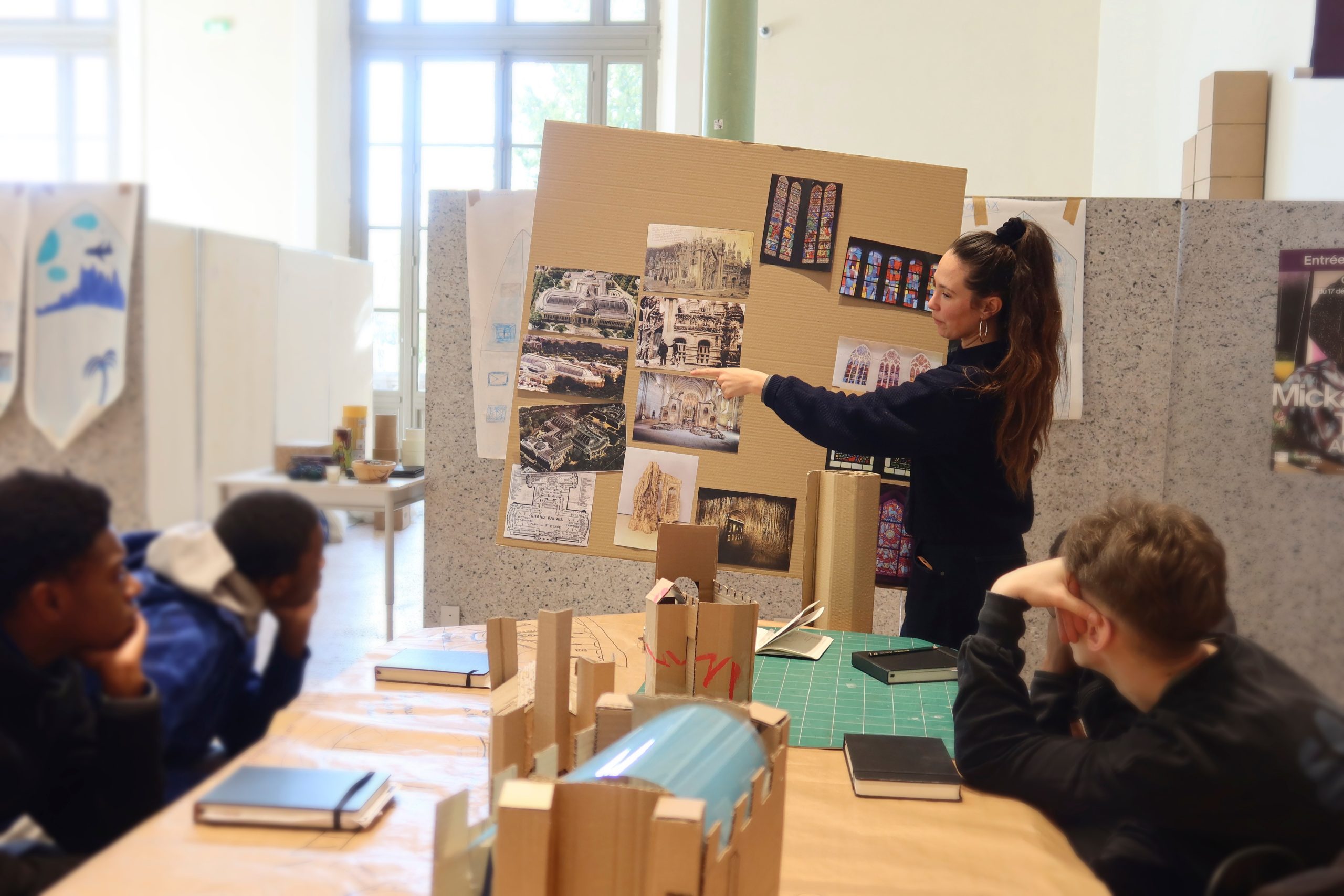 « Inspiré par le défi architectural relevé en 1900 pour la construction du Grand Palais, ainsi que par le travail d’une vie du Facteur Cheval, le Gros Palais est une réflexion et une création autour du “Palais Idéal”, au sens architectural, temporel et philosophique. Fait de carton et de vitraux, le Gros Palais, de Tamaya Sapey-Triomphe et des cinq apprentis ébénistes impliqués depuis plusieurs semaines dans le projet, s’installe dans le salon Seine du Grand Palais afin de faire écho aux questions poétiques et philosophiques que soulèvent notre relation à l’architecture, au rêve, à l’éternité et à la beauté. » (cartel de l’œuvre en cours de construction)