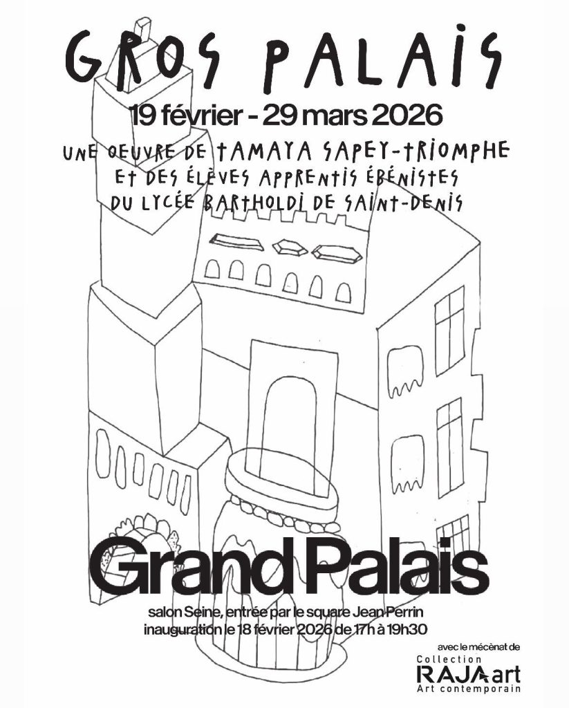 La Collection RAJA est très heureuse de soutenir la production de Gros Palais, une œuvre collaborative de Tamaya Sapey-Triomphe et de cinq élèves en CAP ébénisterie du lycée professionnel Bartholdi de Saint-Denis.